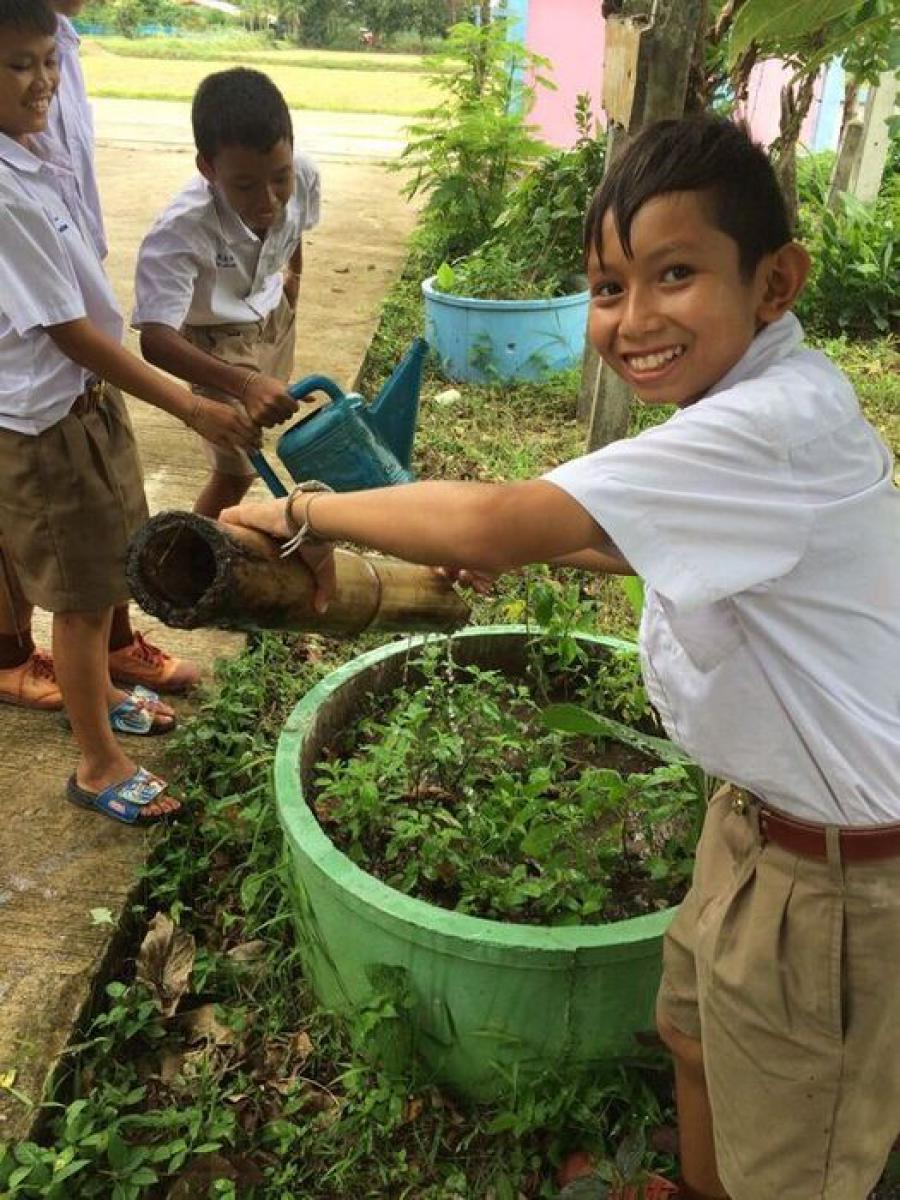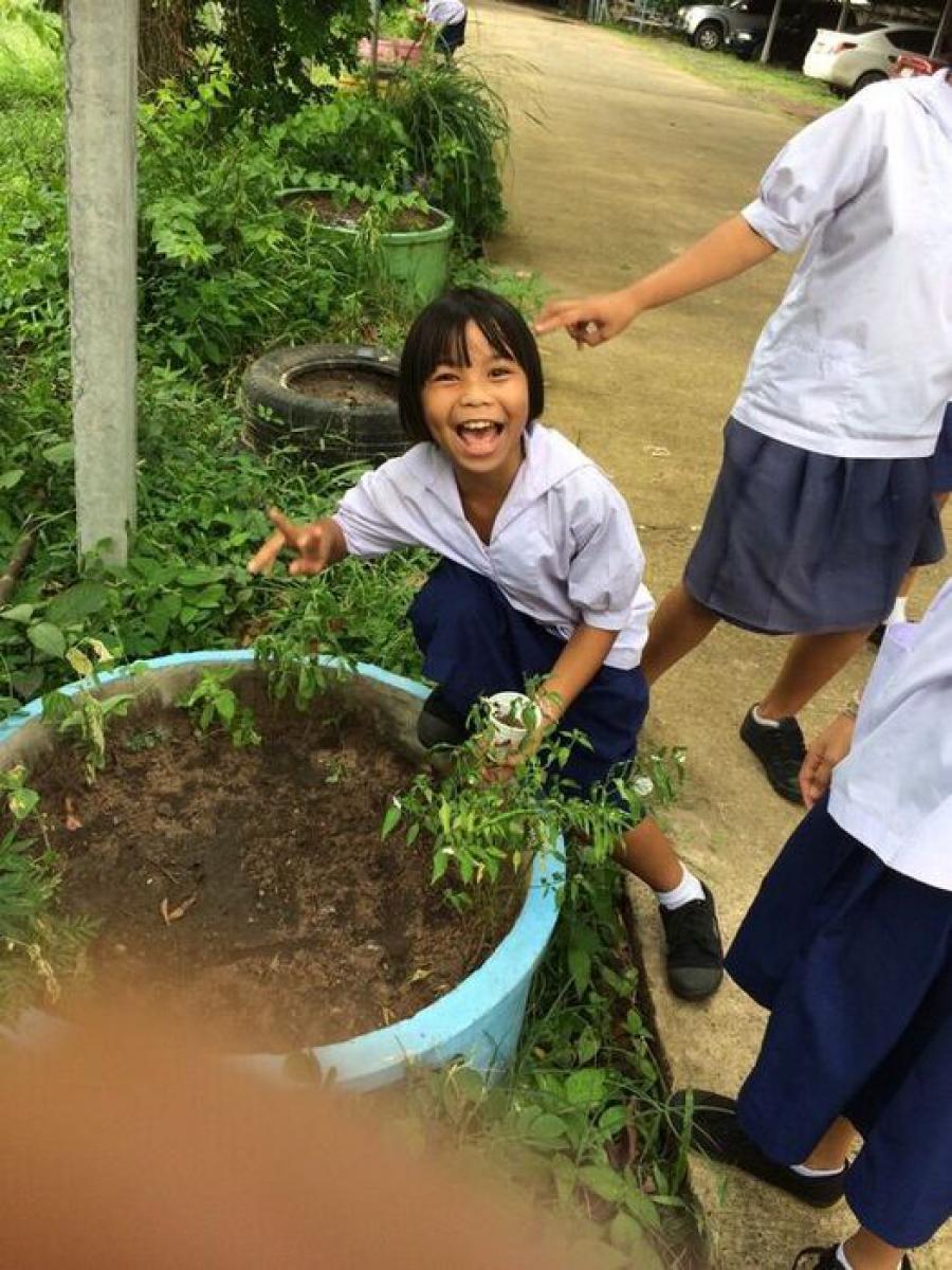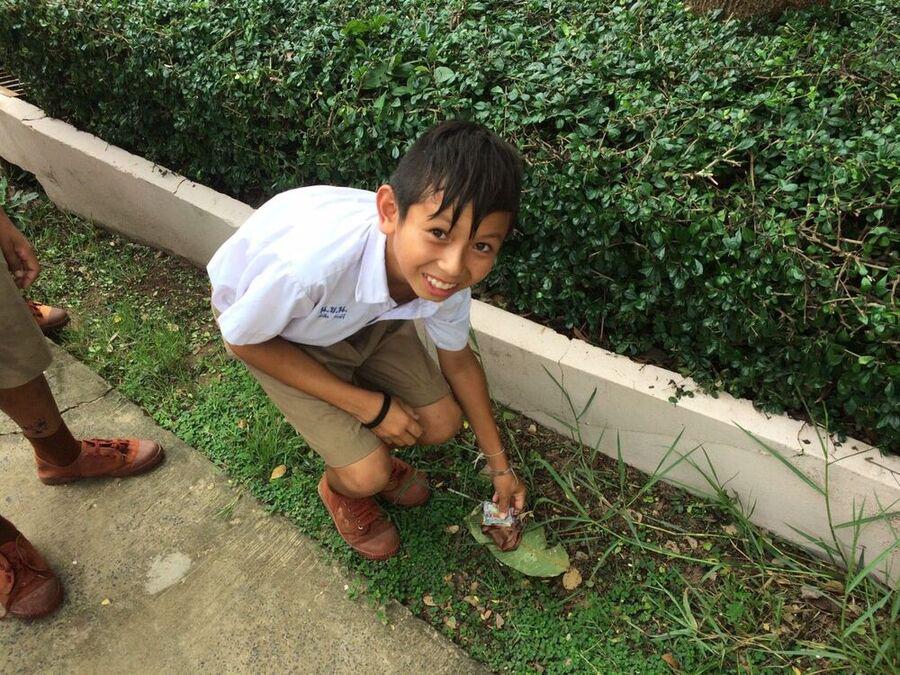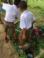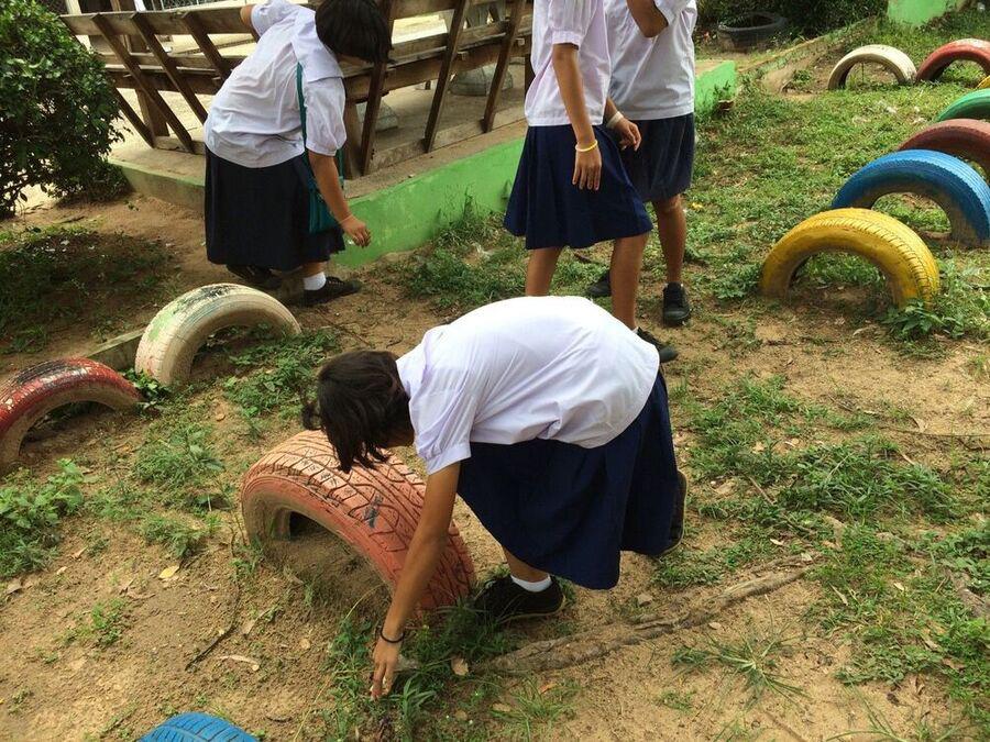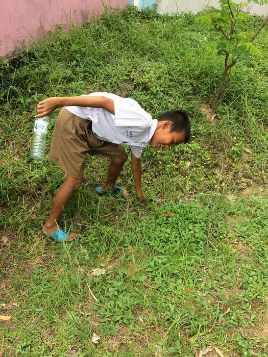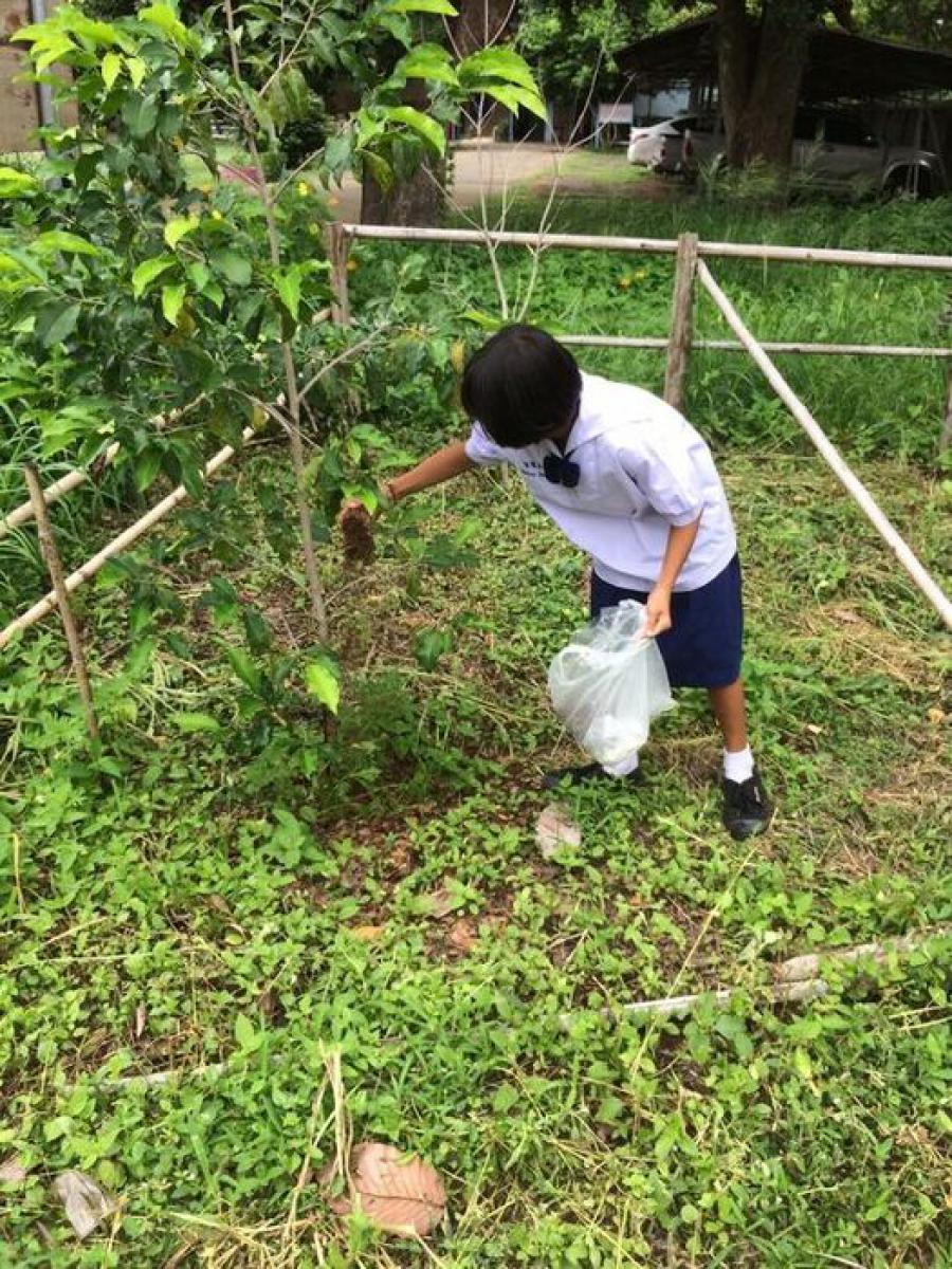นักเรียนชั้นประถมศึกษาปีที่ 6 ช่วยกันรักษาความสะอาด เก็บขยะ รอบบริเวณโรงเรียน S:0